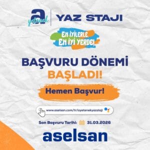 Uluslararası ödüllere layık görülen ASELSAN “a Yetenek Yaz Stajı” Programının başvuru dönemi başladı! Lisans 3. veya 4. sınıftaysan, en iyilerle en iyi yerde olmak ve oyun değiştirici teknolojilerin mimarlarıyla teorik bilgilerini pratiğe dökmek istersen ASELSAN “a Yetenek Yaz Stajı” Programı sadece bir başvuru uzağında.